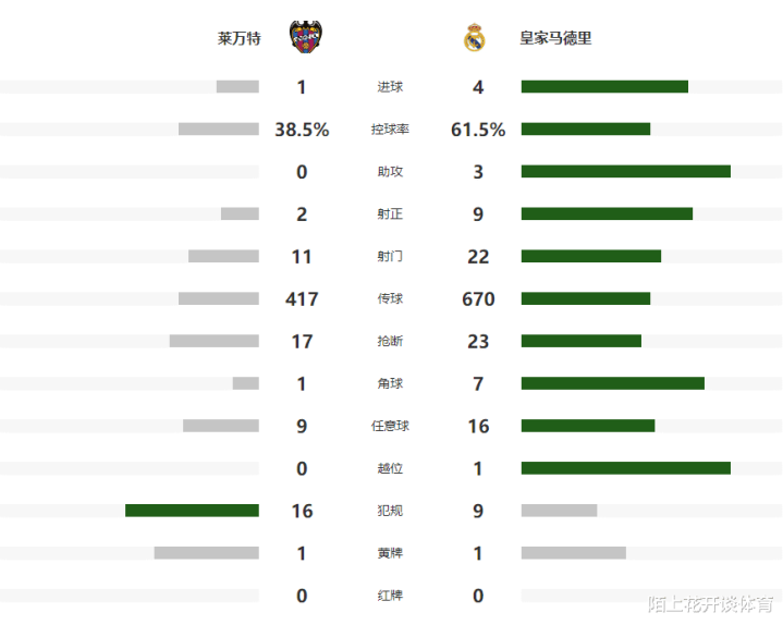 比赛开打之后,主场作战的莱万特就率先发动进攻,第3分钟罗梅罗在皇马禁区接到队友倒三角传中后,推射远角稍稍偏出立柱,10分钟之后,莱万特卷土重来,右侧角球开出后,德拉富恩特在前点头球攻门,皮球又一次擦着立柱出了底线,扛住对手开局三板斧的皇马,随后开始反扑,第28分钟维尼修斯大禁区右侧致敬了皇马传奇莫德里奇,用外脚背弹射打了对手一个措手不及,帮助皇马取得了1-0的领先。