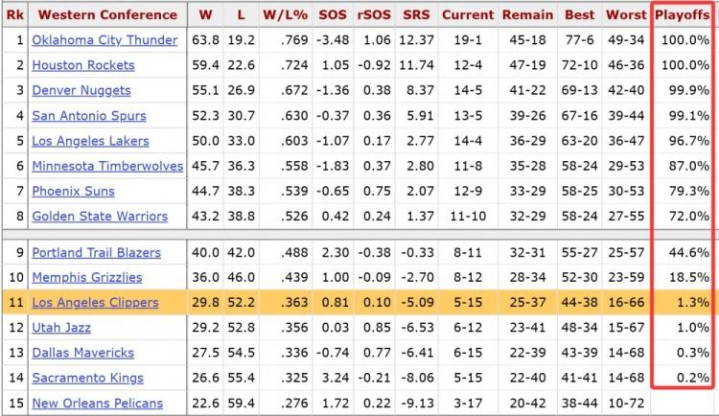本赛季快船队战绩糟糕,目前仅仅5胜15负排名西部第14。数据网站Basketball Reference上显示,快船队目前打进季后赛的概率仅为1.3%,这个概率排名西部倒数第5位,最差战绩可能是16胜66负,最好战绩或是44胜38负。