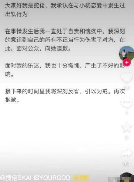 结果还没火多久,就被爆出揽佬出轨睡粉的事情,并且本人还大大方方的承认了。