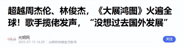 信源:光明网2025-07-15——《超越周杰伦、林俊杰,《大展鸿图》火遍全球!歌手揽佬发声,““没想过去国外发展》