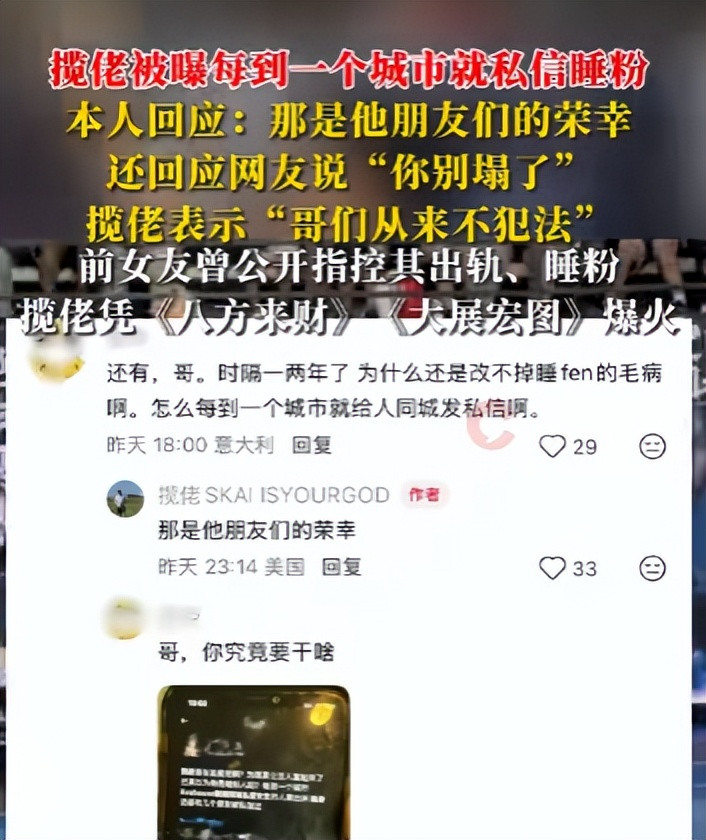 11月25日,有媒体爆出揽佬巡演期间,每到一个城市,就会私信一个当地女粉丝,邀约出来见面。
