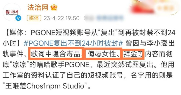 但刚活跃没多久,又因为新歌的歌词暗指侮辱女性与教唆吸毒的嫌疑,PG One再次被群众千夫所指。